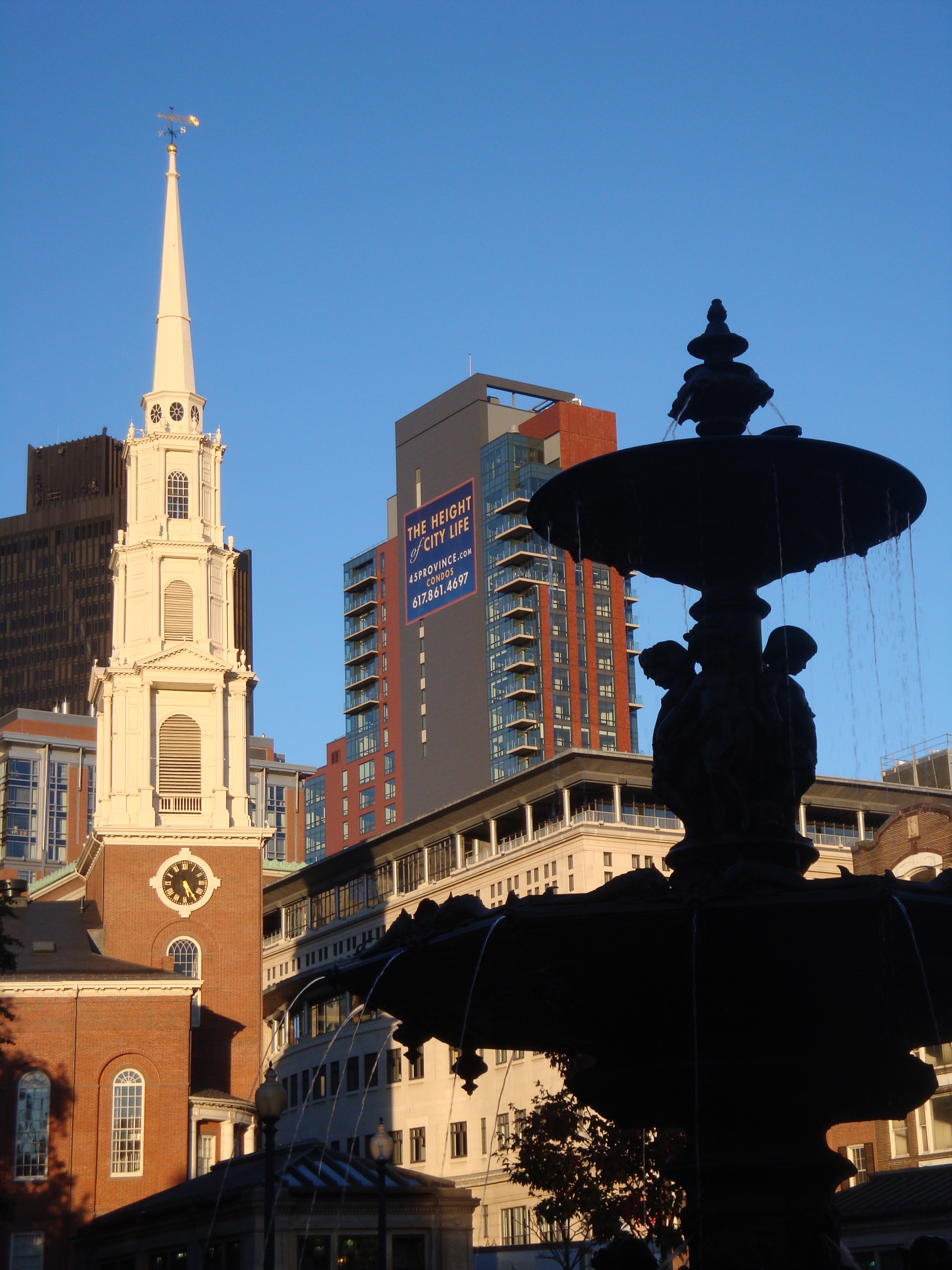 It’s still hard for me to grasp that I have lived more than half of my life in the Boston area; I suppose it’s part of my local identity to be from somewhere else. And within this realm I still identify more with the city than the country where I have lived for many years. But so often I feel my heart is in the city. Stopping to take this photograph last weekend gave me a sense of exhilaration and belonging that, hard as I try, I never feel in the woods. In the city my step is surer and quicker, with more bounce and energy. In nature I have to work to see the details, I am so overwhelmed by the vast landscape – but in the city everything pops in the most pleasant way, just as these buildings seem to spring from the earth, each from a separate time, percolating up like the water in the fountain. The city speaks to me, it lets me be alone in a crowd, it asks me to participate on my own terms and dares me to thrive. The very act of driving in is a thrill – coming over the rise on Route 2 in Belmont it’s like Dorothy’s first view of the Emerald City.