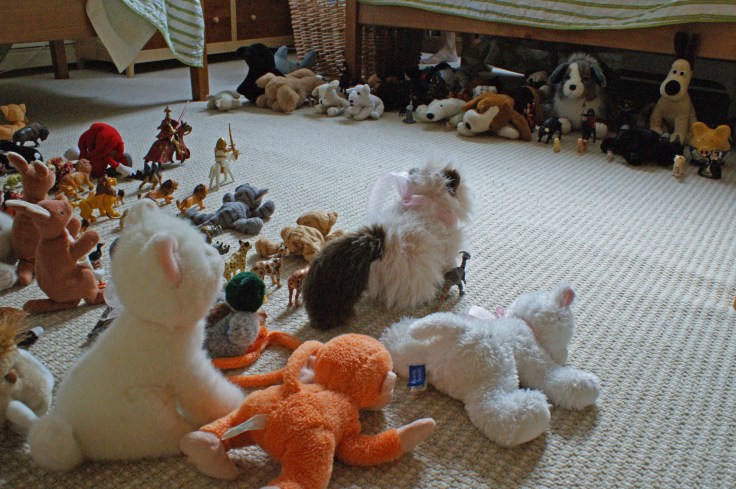 Our boys play a game called cats versus dogs, and as you can see, one side of the room is mostly cats and the other dogs. The game involves a fight modeled on the battle scene in The first Chronicle of Narnia movie, The Lion the Witch and the Wardrobe. Devised by my older son with ASD, it involves charging horses and airborne animals colliding all over the place, accompanied by epic music and battle cries. If you look very closely, the animals and toys that are neither cats nor dogs are divided up (roughly) by good guys and bad guys – Captain Hook with the dogs, Peter Pan with the cats, etc. After the battles, we notice that cats and their friends always win, and the ensuing conversation goes something like this: