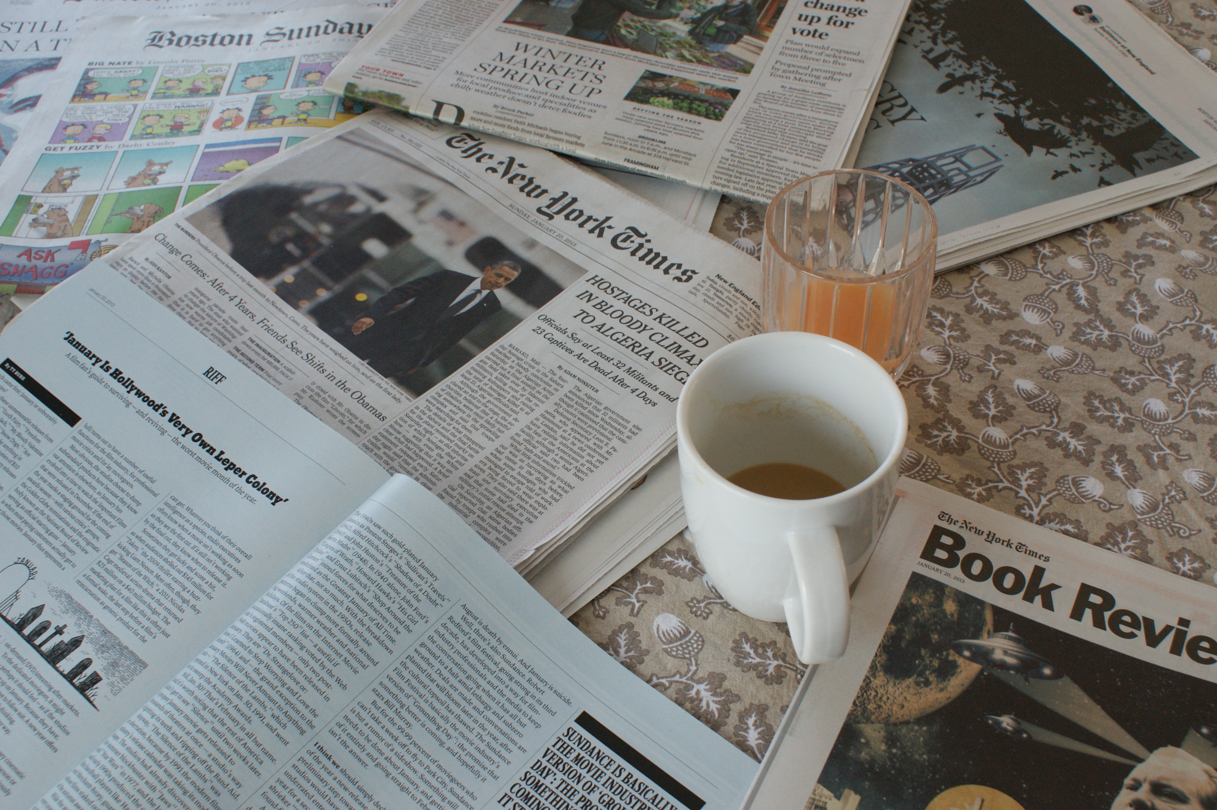 Even though I have read all the major stories online by the time Sunday morning rolls around, I still look forward to sitting down and seeing what I’ve already read in print and the delight of going through each section to read things I know I would missed on any device. Color funnies and Personality Parade (even though it is terrible now)? On paper, only, thanks. Regional news? Still on paper, all week long (I don’t want my kids to ever ask me “What’s a newspaper like?” That would kill me). I set magazines and book reviews aside carefully so that if I don’t get to them they don’t get recycled prematurely. I still keep the front pages from momentous days, good and bad, on my desk upstairs, where they will eventually make their way to a file box in the attic. You can’t pull out a bookmark of a webpage to show children and grandchildren. I still subscribe to the print version of The New Yorker, and in a nod to marital harmony and environmental consciousness, I save only the covers (an interesting family exercise: pull out a random New Yorker Cover and see if we can figure out what happened that week just from that piece of art – the stories we make up are just as interesting as the real explanations).