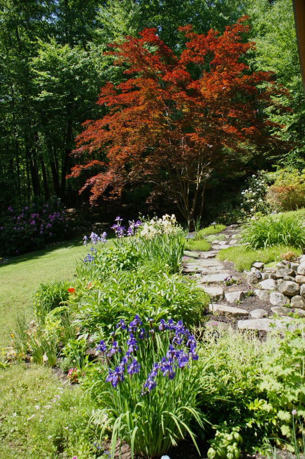 Then the Japanese maple shows its leaves and we know spring is truly here to stay. The garden sits where once there were two more trees lining the stone walk – a flowering pear and a paper birch. But even as they provided welcome shade in the summer, there wasn’t enough water or earth in this former gravel pit to sustain all three trees so we cut the other two down in favor of the maple, and it has thrived ever since, becoming a beloved tree that would make Joyce Kilmer proud. During winter storms we go out to shake any heavy snow or ice off its branches, sometimes in the middle of the night, we are so worried about losing it.