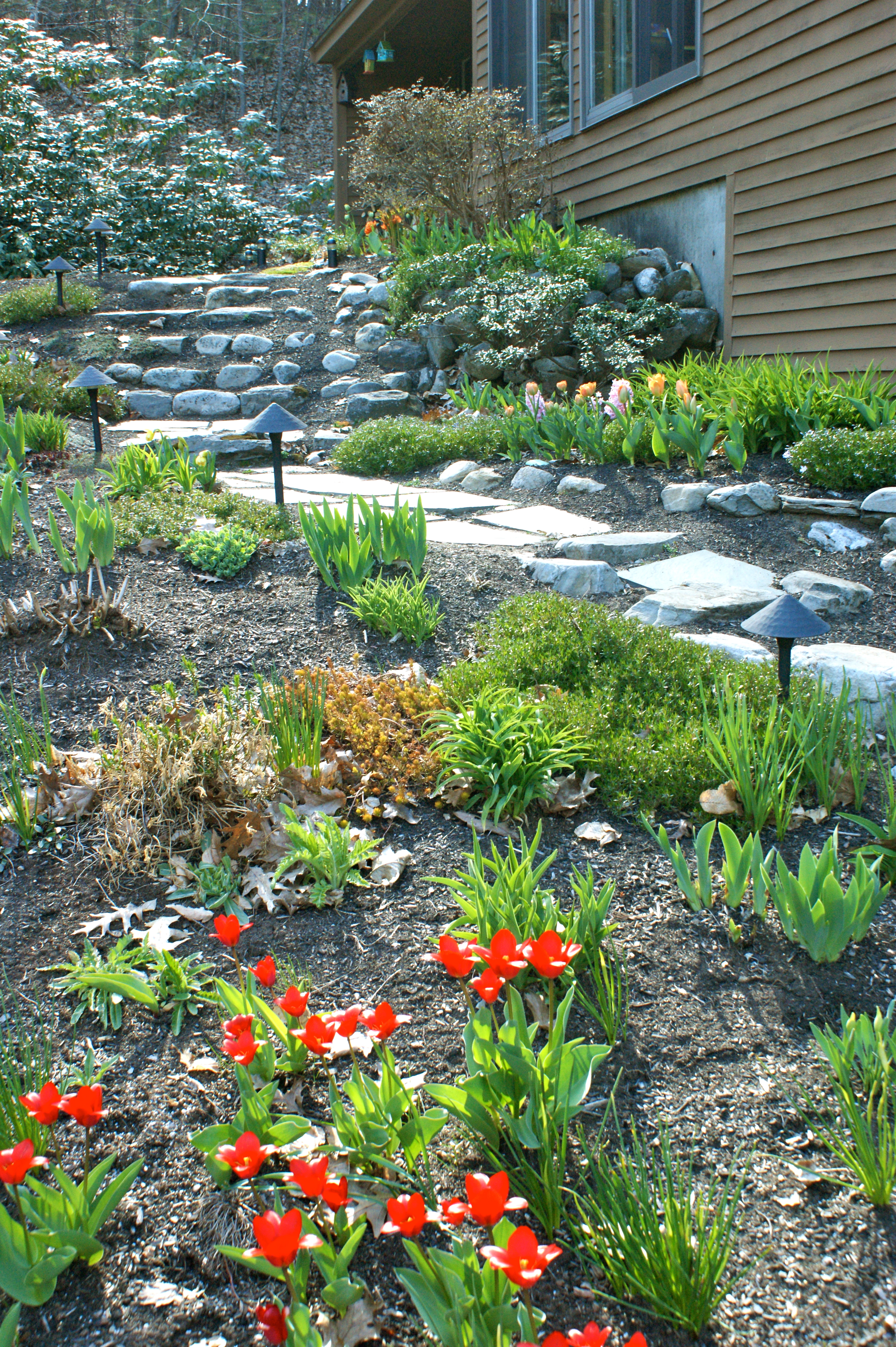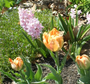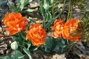 Last spring I took an inventory and ordered more tulips and daffodils to supplement my reds – I wanted orange. The box showed up in late August for fall planting, at which time I promptly broke my foot and was relegated to the couch for 4-6 weeks. My plan was to get them in just after Halloween, but when I went to plant them the box was in the recycling, empty. My husband had come upon them and handed the box to my daughter and told her to plant them, which she did, grudgingly, with little attention to where. So all winter long I waited to see if and where they would come up.